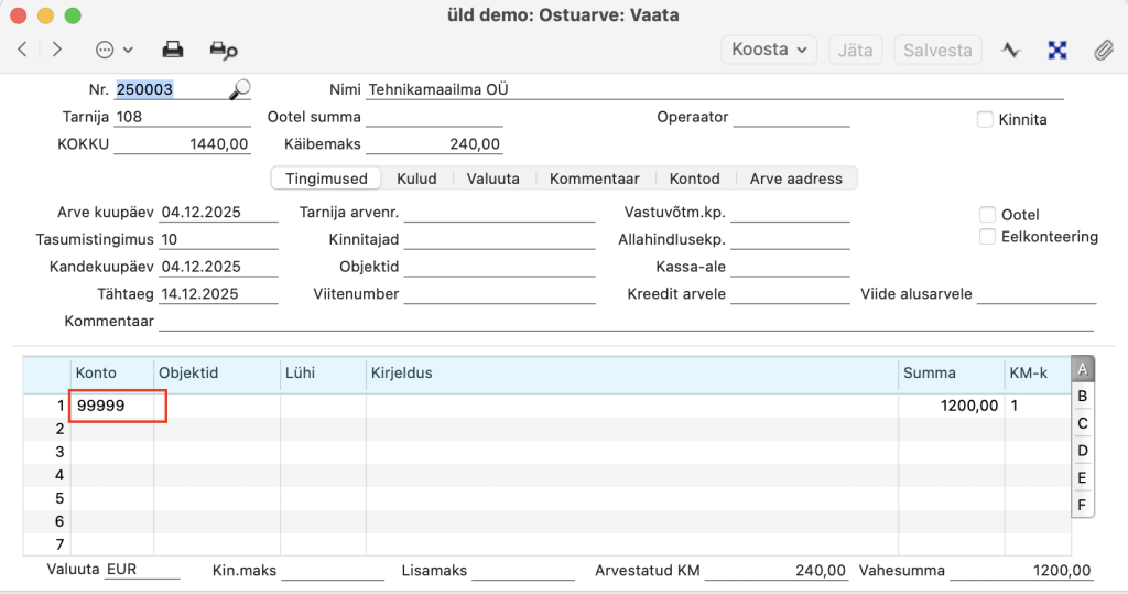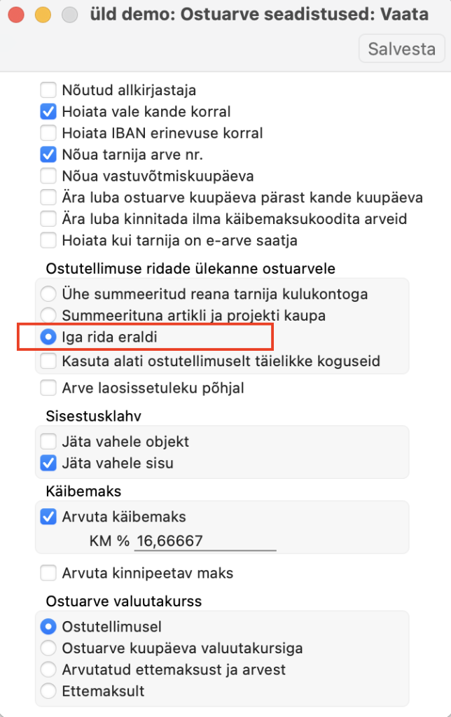 - Moodulis Ostuarved > Seadistused > “Ostuarvete seadistused” märgi valik “Iga rida eraldi“: