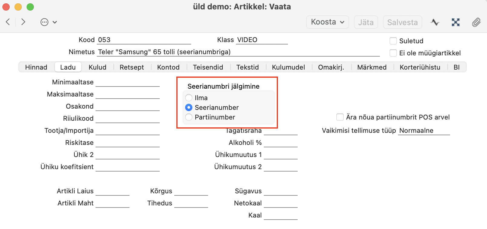 Määra artiklile seerianumber B vahelehel (veerg “Seerianr./Partiinr.“), märgi Laosissetulekule märge „Kinnita“ ja salvesta tavapärasel viisil.