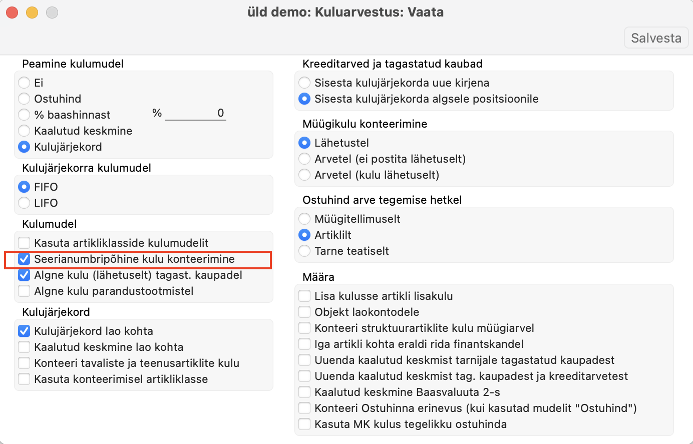 Samuti peate veenduma, et Logistika mooduli seadistuses “Kuluarvestus” on märgitud valik “Seerianumbripõhine kulu konteerimine“: