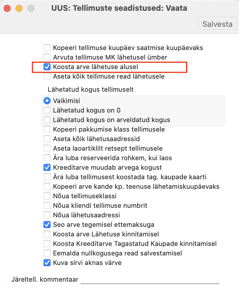 - Kui soovite müügiarvet koostada müügitellimuse alusel, valige moodulis Müügihaldus seadistuses “Tellimuse seadistused” valik “Koosta arve lähetuse alusel“: