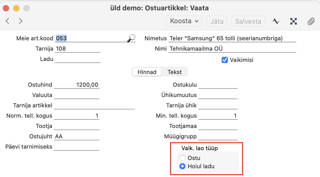 - Kui artikkel on selline, mida hoiate tavaliselt või alati vastutaval hoiul laos, koostage selle jaoks Ostuartikkel (moodulis Logistika > Registrid > Ostuartiklid) ja valige „Vaik. lao tüüp“ = Hoiul ladu