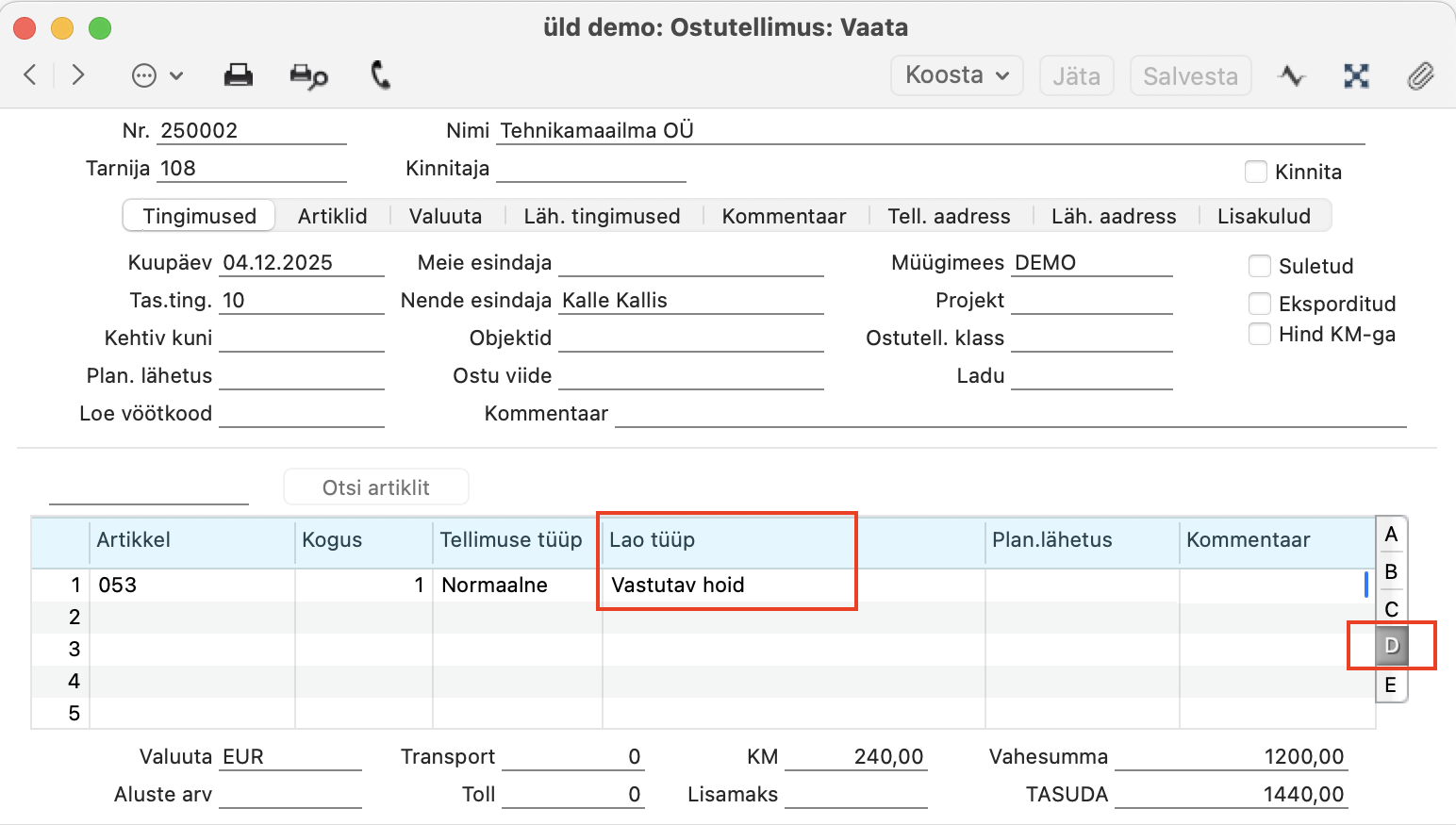 - Koosta Ostutellimus tavapärasel viisil. Kui sisestad artikleid Ostutellimuse ridadele, muuda sellel real (vahelehel D) “Lao tüüp = Vastutav hoid“:
