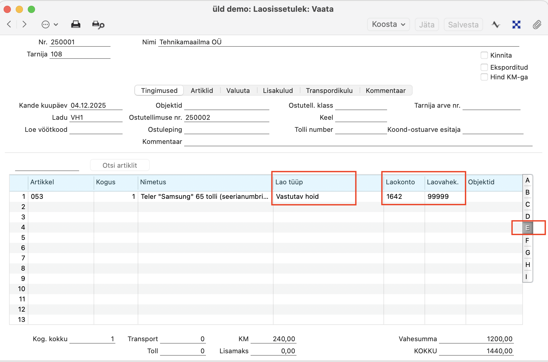 Kui koostasite artikli jaoks Ostuartikli tarnija jaoks (punkt 4 eespool), siis kopeeritakse lao tüüp sellelt Ostuartiklilt ja ostukonto määratakse vastavalt. - Kui võtate Artiklit lattu, koosta Ostutellimusest tavapärasel viisil Laosissetulek, valides Koosta menüüst „Laosissetulek“. Lao tüüp ja laovahekonto kopeeritakse Ostutellimuselt ning “Vastutaval hoiul ladu” konto, mille määrasite “Lausendamine, ladu” seadistuses, tuuakse “Laokonto” veeru alla (nähtavad laosissetuleku E vahelehel):