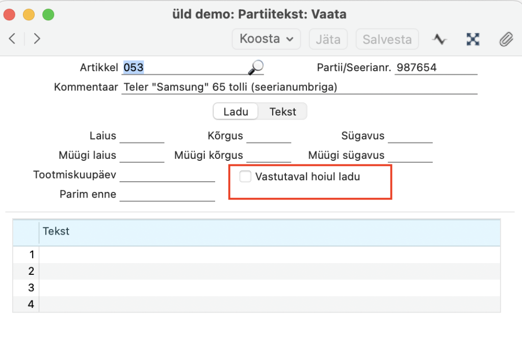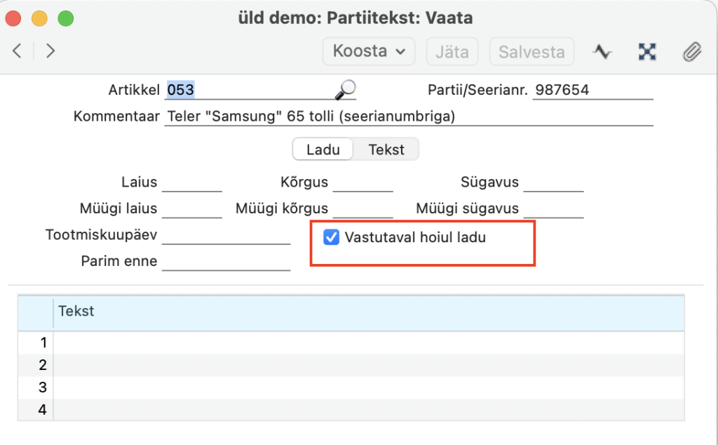 - Seerianumbri kohta koostatakse kaart automaatselt moodulis „Logistika“ seadistuses „Partiitekstid“. Sellel kaardil märgitakse valik „Vastutaval hoiul ladu“, mis tähendab, et seerianumber on teie ettevõtte vastutusel: