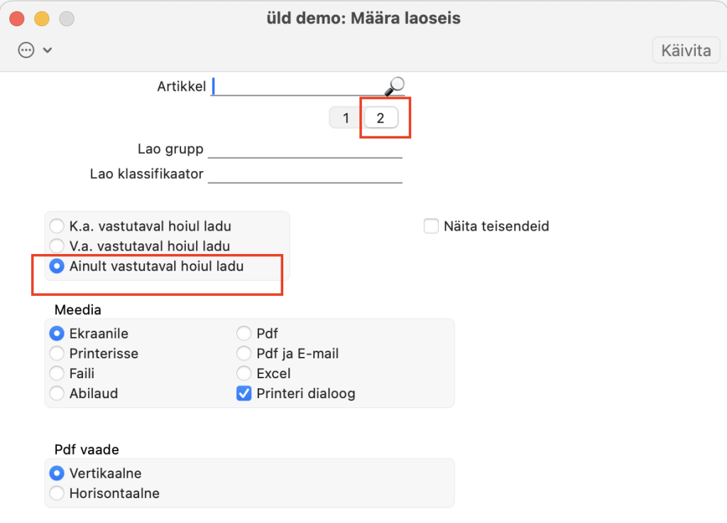 - Kui vajate nimekirja artiklitest, mis on teie vastutusel, koostage aruanne „Laoseis“ ja valige valik „Ainult vastutaval hoiul ladu“: