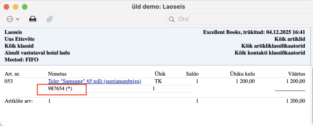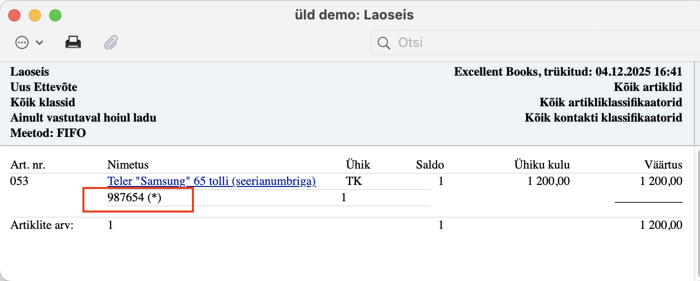 Kui valite aruande määramisaknas ka valiku “Näita seerianumbrit“, märgitakse vastutaval hoiul laos olevate Artiklite seerianumbrite juures märge tärniga (*):