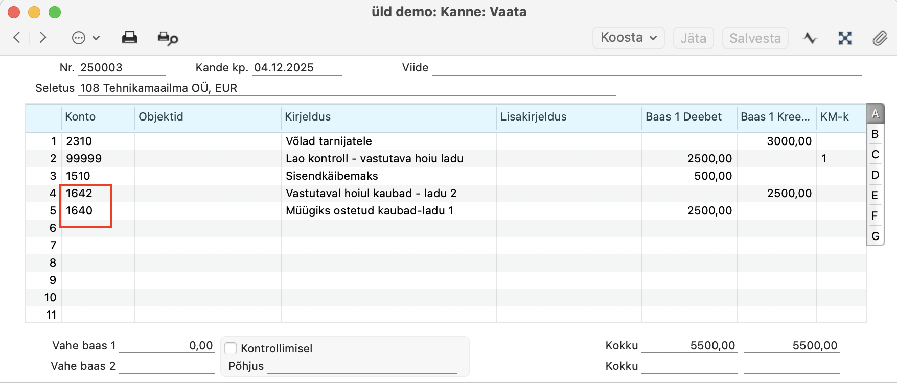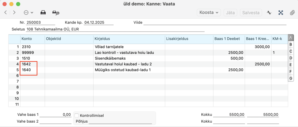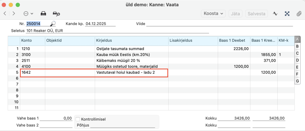 - Kui müüd artiklit, mis on vastutaval hoiul, krediteeritakse „Vastutaval hoiul ladu“ (vahelehel „Ladu“), mitte „tavalist“ laokontot. Näide: müügiarvest tekkiv finantskanne