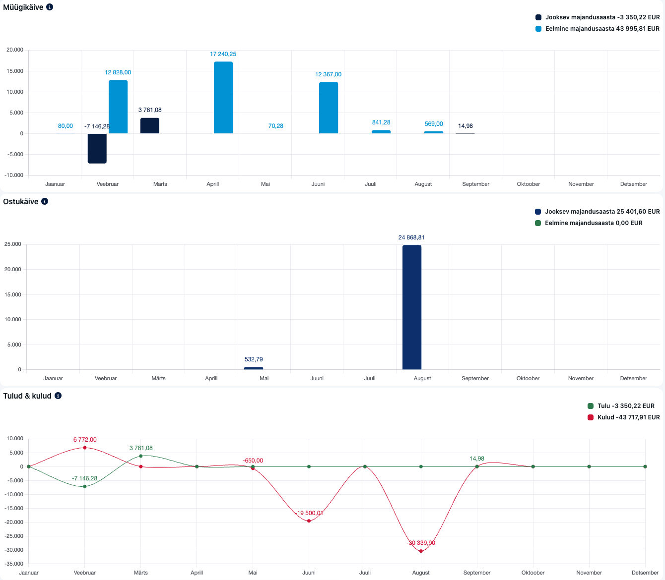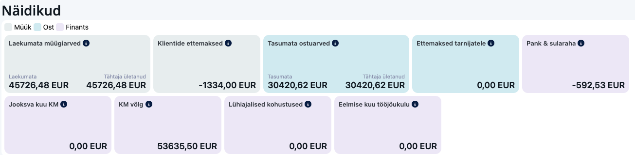 Excellent Portali näidikute leht annab kiire ja visuaalse ülevaate ettevõtte finantsseisust – müük, ostud ja finantsnäitajad. Andmed kõikides näidikutes ja graafikutes uuenevad automaatselt iga 3 minuti järel.