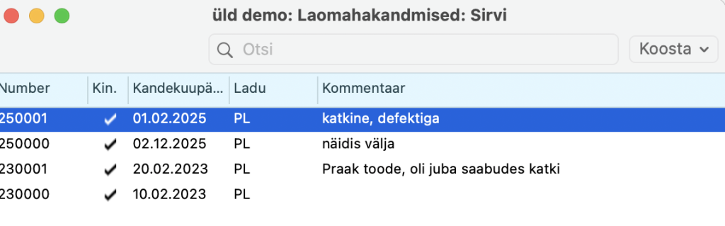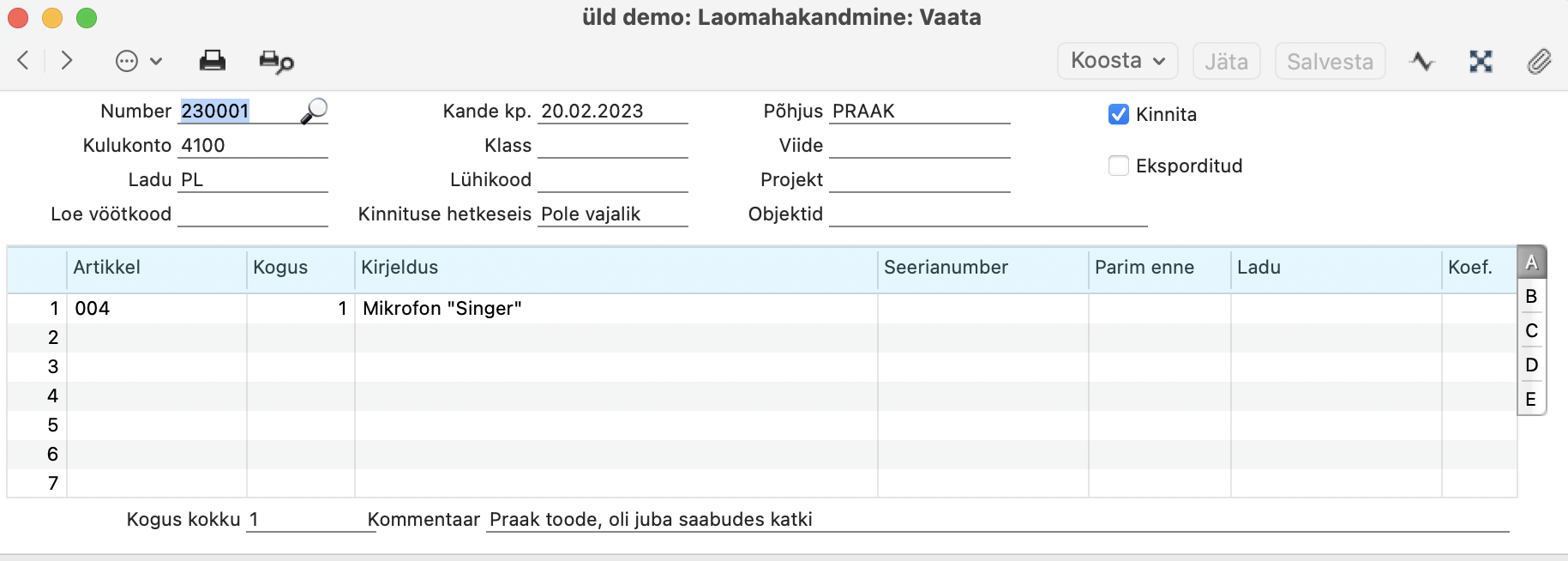Laomahakandmise number: vaikimisi sisestub esimene kasutamata number esimesest numbriseeriast seadistusest “Numbriseeriad – Laomahakandmised“. Vajadusel saad seda muuta, kuid mitte juba kasutatud numbri vastu. Mitmekasutaja paketis antakse laomahakandmisele number kaardi salvestamisel.