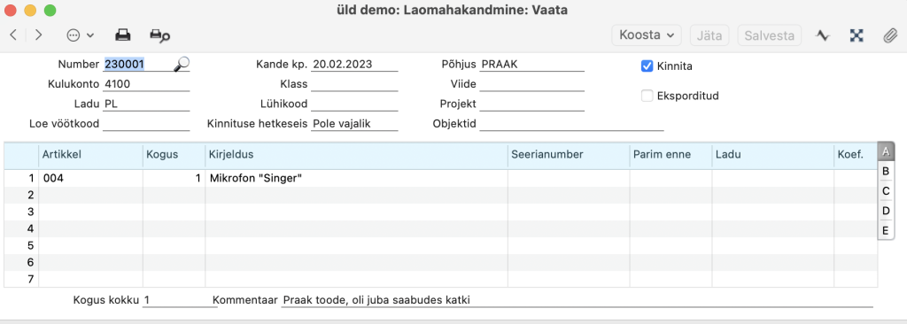 Igale reale saad määrata eraldi Kulukonto. Reale sisestatud Kulukonto arvestatakse enne päises näidatud Kulukontot. Lühikoodi valimisel sisestub Kulukonto automaatselt. Siin näed artikliklassi materjalikulu erinevuste kontot, siis kui Mahakandmine on koostatud hooldusfunktsiooniga Inventuurivõrdlus, kaup kantakse maha Tootmislaost, Artikkel kuulub Artikliklassi ning Kuluarvestuse seadistuses on märgitud Kasuta konteerimisel artikliklasse. Sellisel juhul registreerib antud Konto tootmisjäägid.