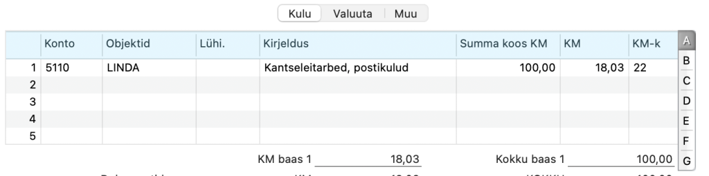 - Summa koos KM – Sisestage siia kulutuste summa koos käibemaksuga. Kui olete määranud valuuta kas päises või vahelehel F, peab see summa olema selles valuutas.