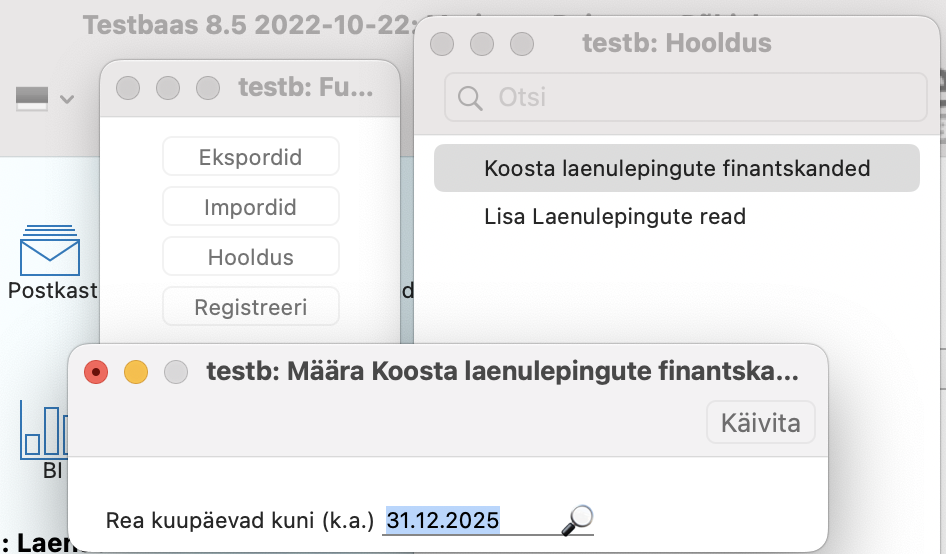 Moodulis Laenud > Funktsioonid > Hooldused > “Koosta Laenulepingutele finantskanded“. Sisesta siin kuupäev (tavaliselt eelmise kuu viimane päev). See hooldus lisab finantskanded kõigile eelneva kuu kui ka eelnevate kuude ridadele Laenudel, millel veel finantskannet ei olnud.