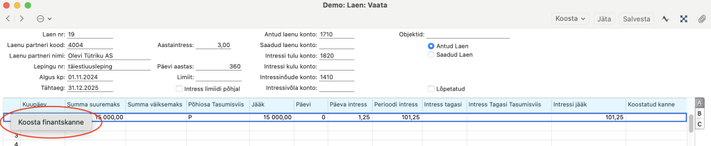 B) Laenu kaardi peal vali Operatsioonid > vali “Lisa laenulepingu rida“. Uue rea kuupäevaks lisatakse automaatselt möödunud kuu viimane päev, toimub igakuine intressiarvestus ning muutub väli „Intressi jääk“.