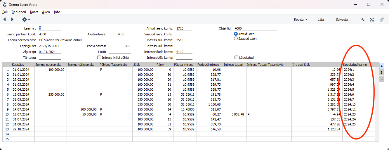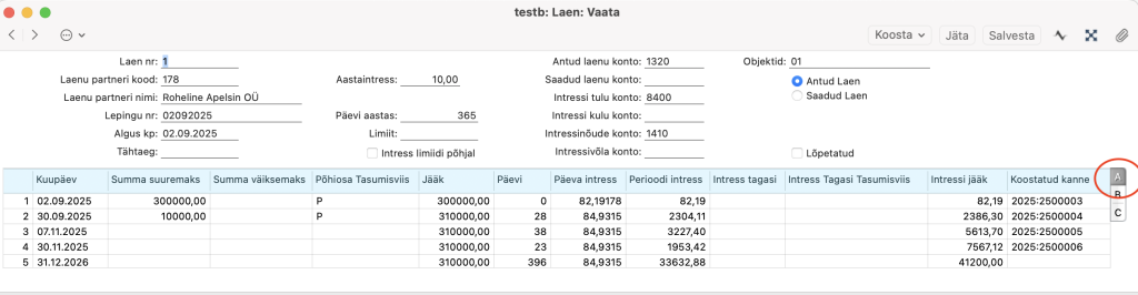 “Jääk, Päevi, Päeva intress, Perioodi intress, Intressi jääk” – Nendel väljadel saad kontrollida automaatseid arvutusi. Need väljad on automaatselt arvutatud, kasutaja neid ei saa muuta.