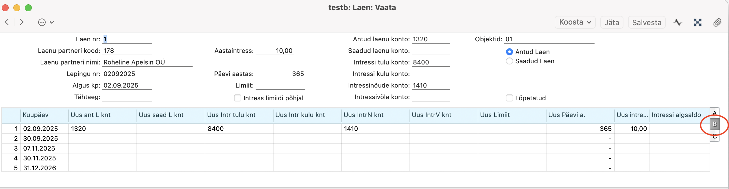 B vahelehe väljad määravad, millistele kontodele laen ja intressid kantakse ning millise intressimääraga arvestus käib. Neid välju saad muuta, näiteks kui lühiajaline laen muutub pikaajaliseks või intressimäär muutub.