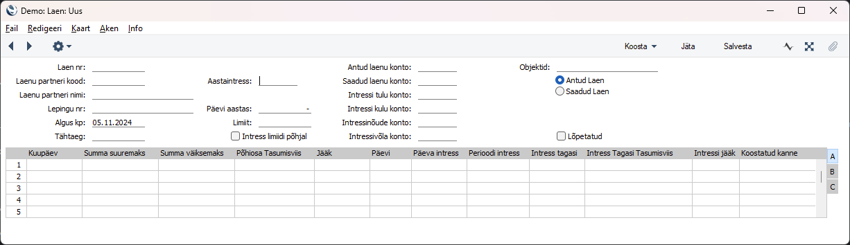 Laenu kaardil on palju andmeväljasid, mõned on paigutatud paremal asuvatele vahelehtedele A, B, C.
