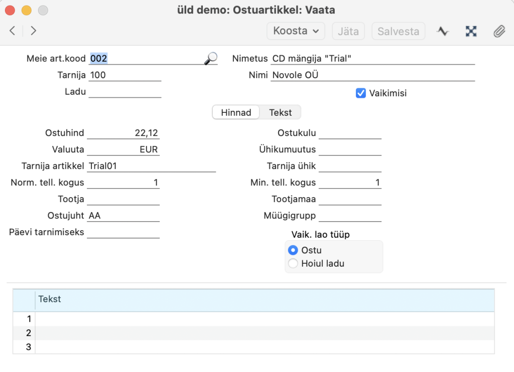 Vaikimisi – Sama artikli kohta võib registreerida mitu ostuartiklit, nii et on võimalik salvestada iga tarnija küsitavad hinnad. Igale artiklile saad määrata ühe vaikimisi ostuartikli. Märgi see valik ostuartiklil, mis on registreeritud tarnijale, kellelt sa eelistatult antud kaupa ostad.