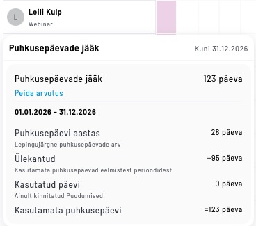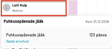 Töötaja näeb oma puhkuse jääki, kui vajutab hiirega oma ikoonile, kus avaneb “Puhkusepäevade jääk“. Selle all on näha puhkuse arvestus ehk päevade arv kuni aasta lõpuni