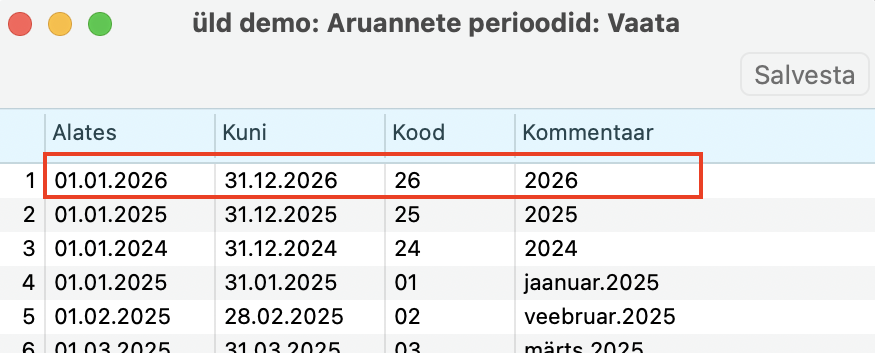 Kõige ülemisele reale lisa uus periood(id). Kui soovid ka iga kuu perioodi aruannetes valida, siis lisa aasta rea alla lisaread iga kuu jaoks eraldi.