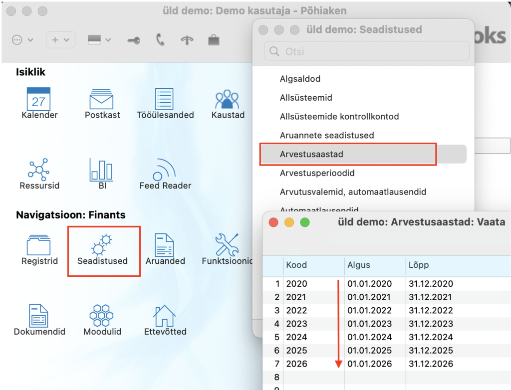 Käsitsi seadistuse täitmiseks mine moodulisse Finants > Seadistused > Arvestusaastad.