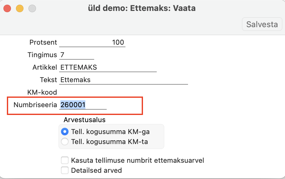 Ava seadistus ja lahtrisse „Numbriseeria“ sisesta uue aasta ettemaksuarvete numbriseeria esimene number.