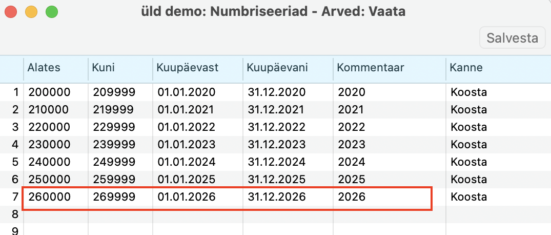 NB! Kui sinu ettevõte kasutab andmevahetust väliste süsteemidega (näiteks: pangaliides, e-arved, Scoro, Telema vms), siis peab olema loodud uus numbriseeria juba enne vana arvestusaasta lõppemist.