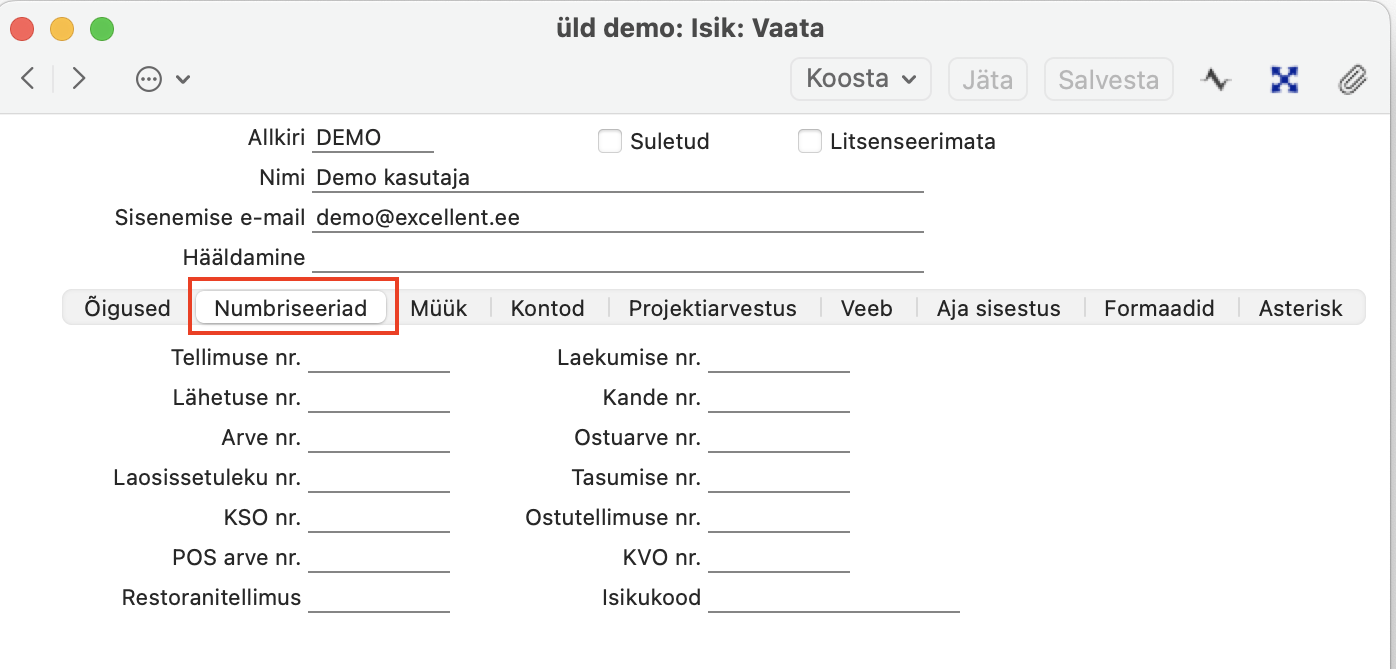 Juhul, kui oled Isiku kaartidel eelnevalt kasutanud ja määranud kasutajatele oma numbriseeriad, siis uuenda neid kaarte. Moodul Üldine > Registrid > Isikud > vaheleht “Numbriseeriad” > vali uus algusnumber uuest majandusaasta numbriseeriast.