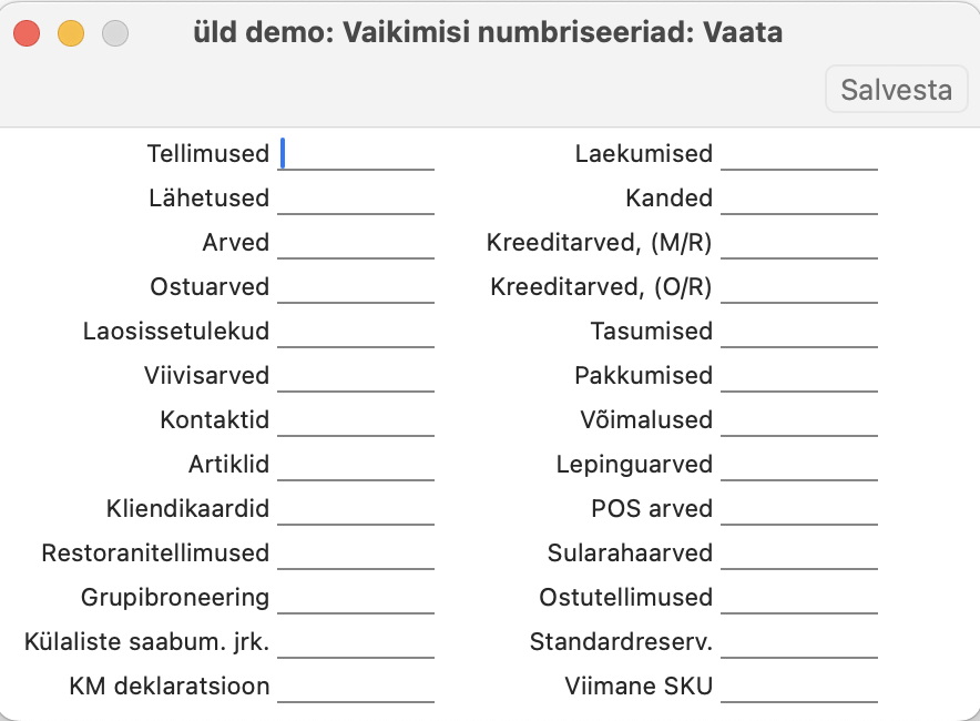 Käsitsi seadistuse täitmiseks vali moodul (näiteks Müügiarved) > Seadistused > “Numbriseeriad – …” (näiteks“Numbriseeriad – arved”). Sarnaselt täida teiste dokumentide numbriseeriad teistes moodulites, mida kasutad.