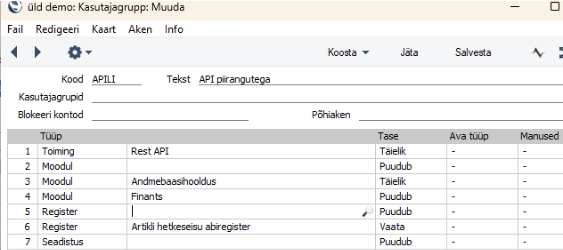 Kuite soovite, et kasutaja API ei näeks ühtki teist moodulit peale Andmebaasihoolduse ja registri “Artikli hetkeseisu abiregister”, siis peab sellele kasutajagrupile loetlema kõik moodulid eraldi, mida näha ei tohi. Pildil on näide mooduliga Finants (rida 4-7). Järgnevatele ridadele (alates rida 8) saate kõik ülejäänud moodulid samamoodi lisada.