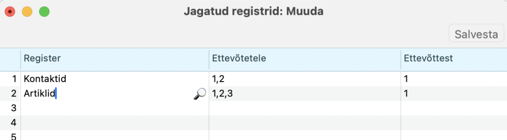 Kui otsustad jagada kindla ettevõtte registrit (täidad veeru “Ettevõttes“), siis hakatakse jagama selle ettevõtte olemasolevaid andmeid teiste ettevõtetega.