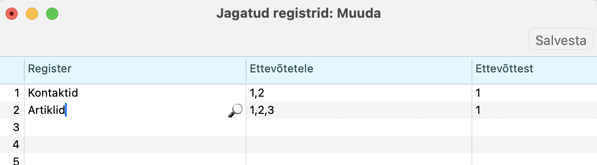 - NB! Kui oled jagamist kasutanud mingi aeg ja soovid “Jagatud registrite” funktsiooni kasutamist lõpetada, siis ära lihtsalt kustuta seadistuse ridu. “Jagatud registrite” seadistusest on võimalik registrit eemaldada, kuid seda tuleb teha ettevaatlikult. Teil võib tekkida soov kopeerida jagatava registri kaardid eraldi igasse ettevõtetesse, et saaksite neid peale jagamise lõpetamist kasutada.