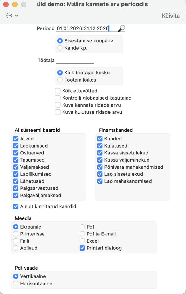 “Sisestamise kuupäev” (vaikimisi valitud) – kui määramisaknas on tehtud see valik, siis kuvatakse aruandesse kaardid, mille sisestamise kuupäev (mitte kande kp) jääb määratud perioodi sisse.