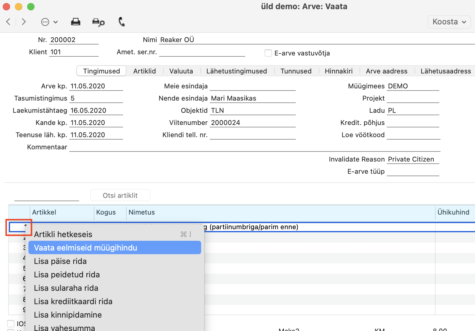 Müügiarvete moodulis arve peal on Koosta menüü all valik “Vaata eelmisi müügihindu“. Selleks tuleb enne aktiveerida artikli rida, vajutades rea numbri peale, ja siis aktiveeritud rea peal vajutada hiire parema klahviga, avaneb menüü