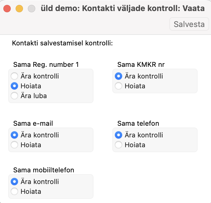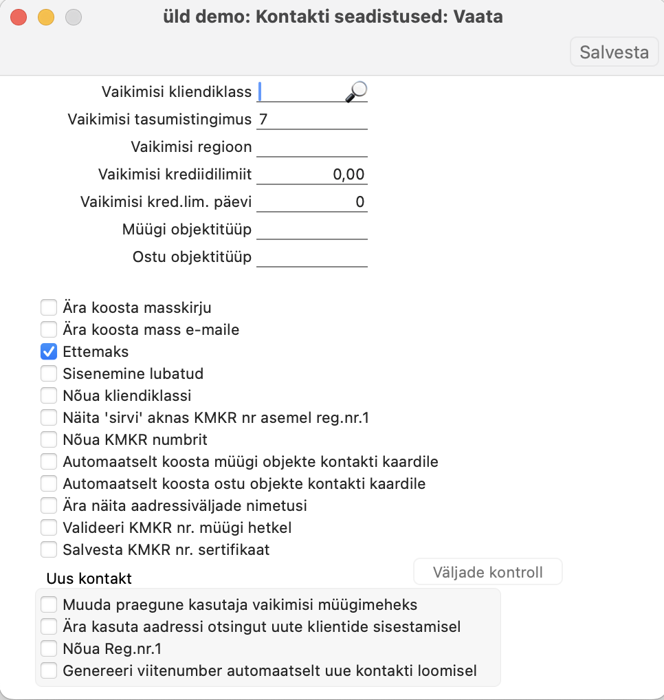 Need valikud loovad Objekte ainult kontaktidele, kes on määratud kliendiks või tarnijaks, mitte teistele kontaktidele, nagu näiteks kontaktisikud. Veenduge, et uus Kontakt on enne esmakordset salvestamist märgitud kas kliendiks või tarnijaks, vastasel juhul Objekte ei looda.