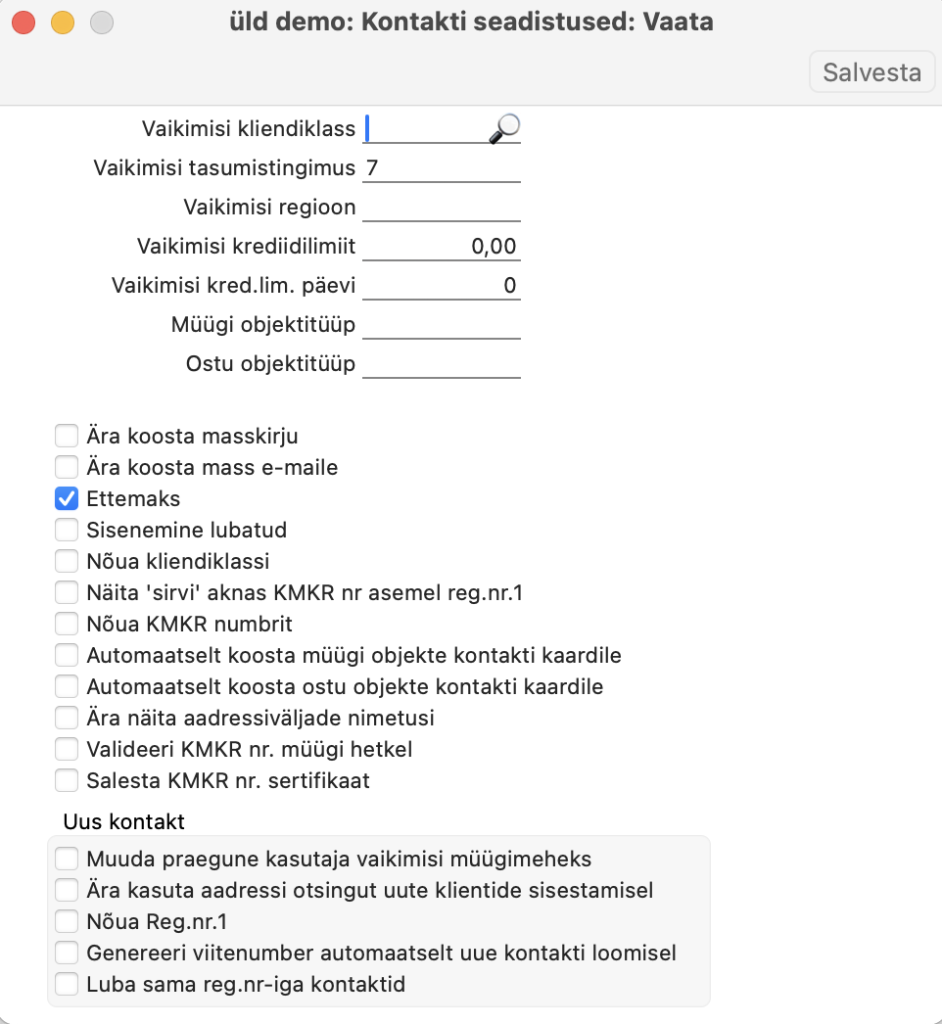 Kui valite selle valiku, täidetakse automaatselt iga uue Kontakti kaardil “Müügimees” väli praeguse kasutaja allkirjaga/isiku koodiga. Kui seda ei märgi, jääb lahter “Müügimees” tühjaks.