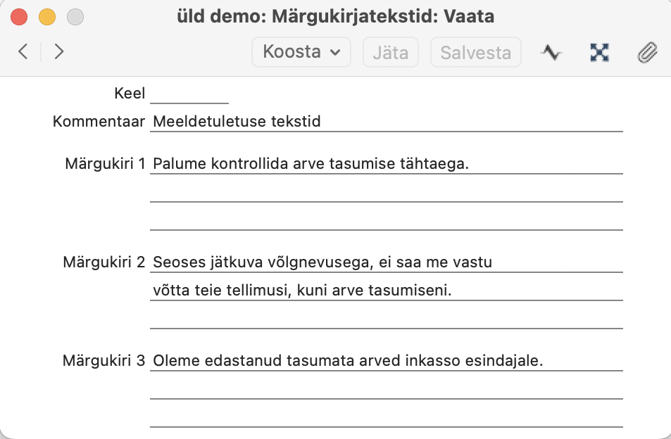 Soovitav on sisestada üks Märgukirjateksti kaart, millel jätta Keele väli tühjaks. Sellel määratud teateid kasutatakse Arvete puhul, millele ei ole Keelt määratud ning arvete puhul, millele määratud Keelele ei ole sisestatud Märgukirjatekste. Näiteks, kui arve Keeleks on inglise keel ja inglise keelele pole Märgukirjatekste salvestatud, kasutatakse tühja Keele väljaga Märgukirjateksti kaarti.