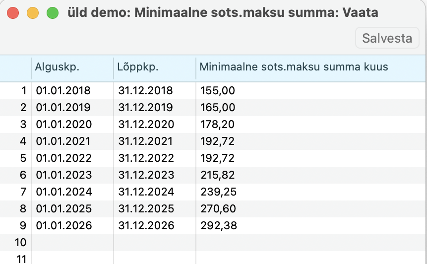 Siin seadistuses määratakse minimaalne sotsiaalmaksu summa ja selle kehtivusaeg. Minimaalset sotsiaalmaksu summat kasutatakse koos Töötaja kaardi ‘Maksud‘ osal linnukesega “Arvesta minimaalset sotsiaalmaksu summat“.