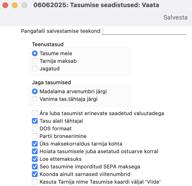 See seadistus sisaldab parameetreid, mis reguleerivad Tasumiste registri ja eksportfunktsiooni “SEPA maksed” käitumist.