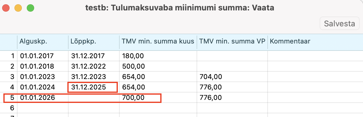 NB! Kui Töötaja soovib näiteks aasta keskel muuta tulumaksuvaba miinimumi (TMVM), tuleb siin seadistus muuta enne palga arvestuse kaartide koostamise hoolduse käivitamist. Alati lisa uuele reale uus kuupäev ja uus summa.