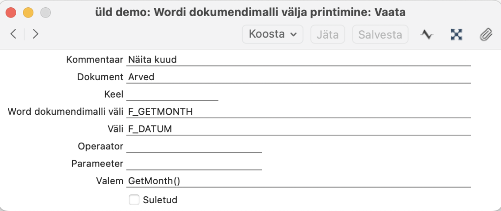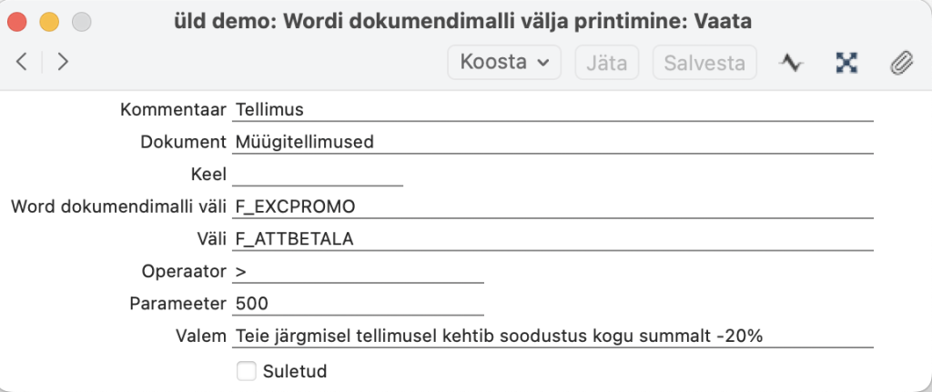 Kui kaart on valmis ja salvestatud, siis saad Wordi mallile lisada ka vastav “Väli” nimega F_EXCPROMO ja dokumendi väljatrükil võetakse aluseks “Väli” Tasuda (F_ATTBETALA). Kui tasuda summa on >500, siis kuvatakse dokumendi väljatrükil uus lisa Väli.