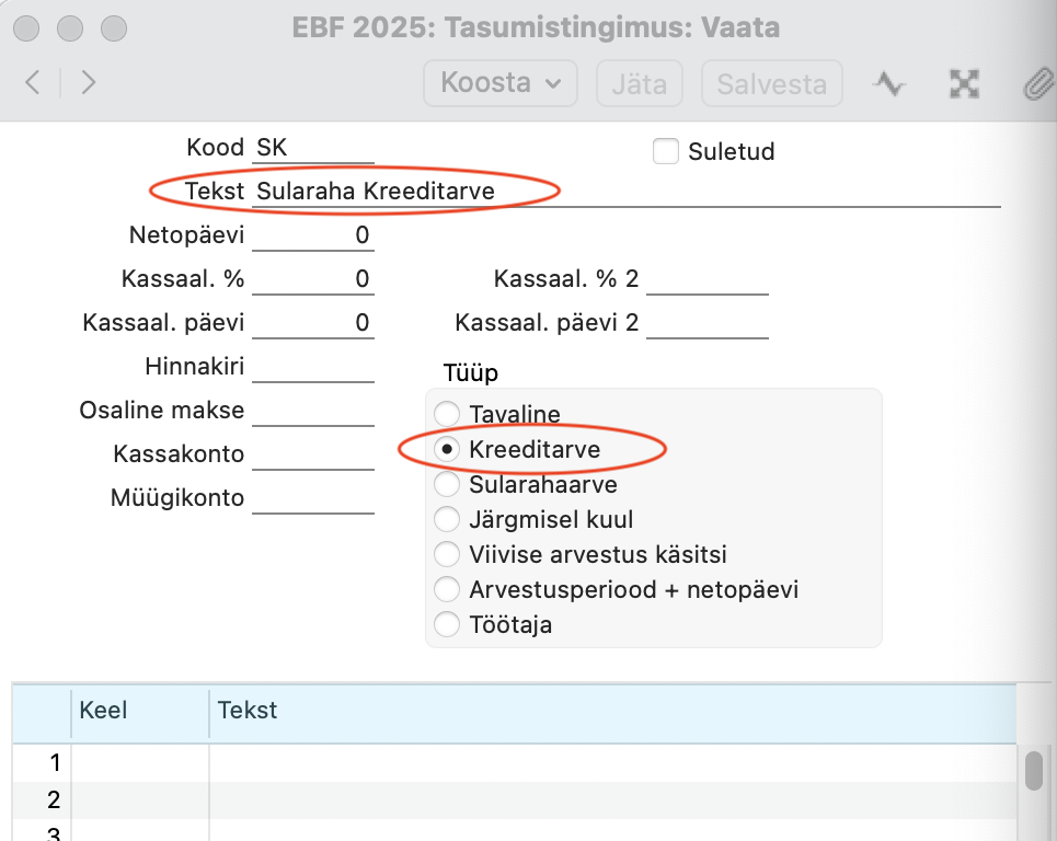Sularaha kreeditarve jaoks koosta eraldi Tasumistingimuse kaart tüübiga “sularaha“. Näide:
