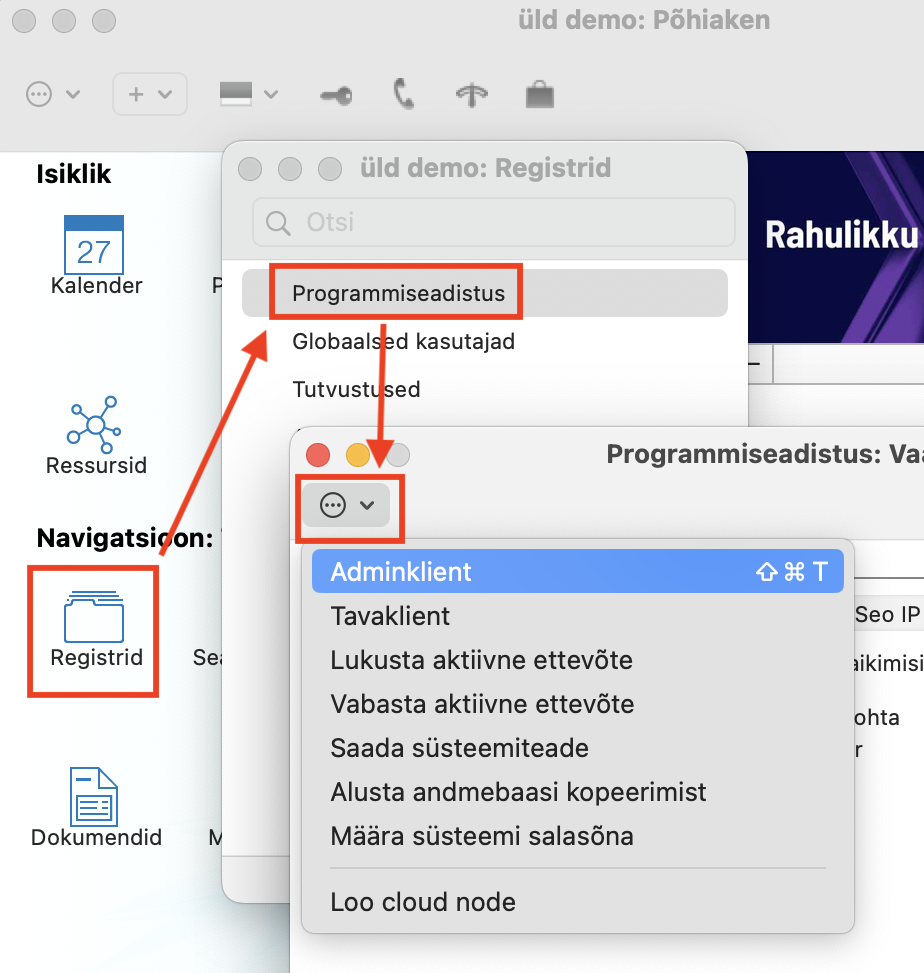 - Mine moodulisse Tehnika, ava register “Programmiseadistus”. Vali operatsioonide(“hammasratta“) menüüst “Adminklient”. Ekraanile ilmub hoiatus, vajuta OK