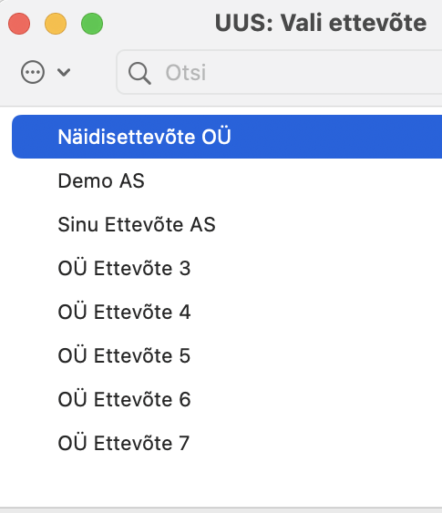 Seejärel avaneb “Vali ettevõte” aken, kus vali nimekirjast uus ettevõte ja sisene. Sisene uude ettevõttesse ja saad alustada algseadistuste importimist ning seejärel andmete sisestamist. NB! Enne kui hakkad uusi algandmeid sisestama, impordi kindlasti algseadistused.