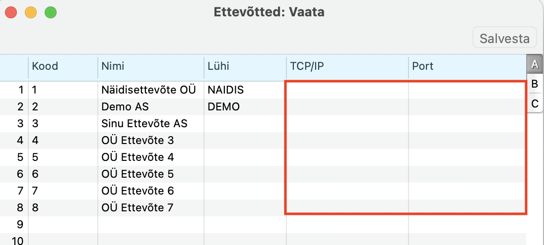 Avanenud väikses akna peal operatsioonide menüüst vali “Ava ettevõtete register”. Avanenud ettevõtete tabel näitab sulle, mis ettevõtted on praegu serverprogrammis loodud. - Sisesta järgmisele vabale reale uus ettevõte, täida: