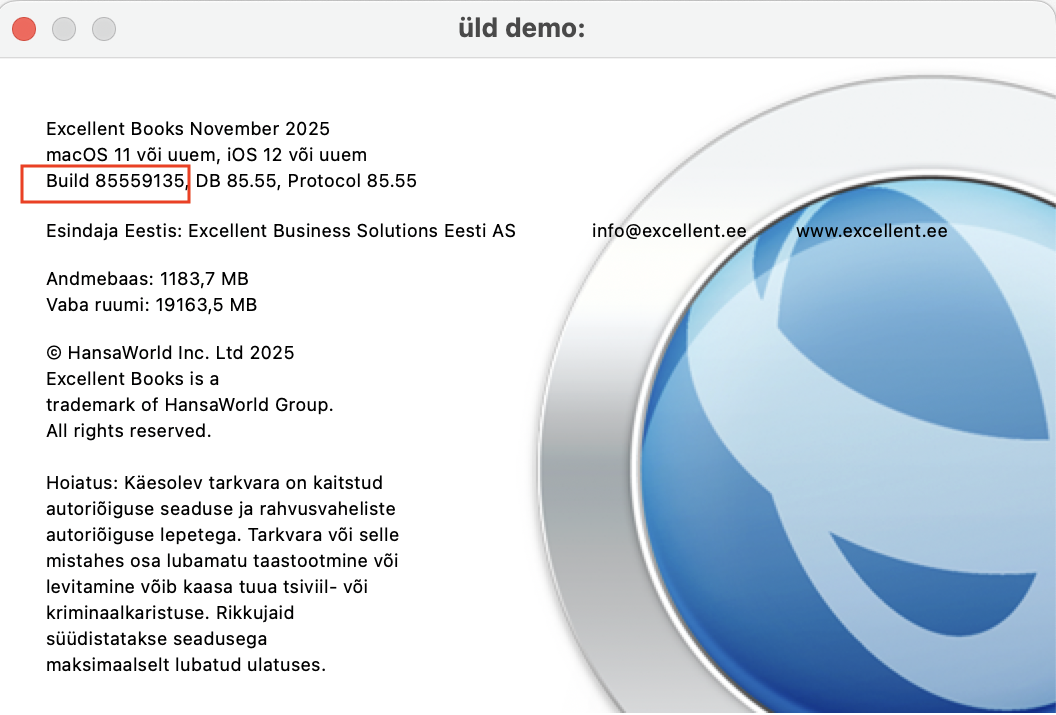 Kontrolli oma Standard Booksi versiooni, valides programmi ülevalt menüüst “Info” > valik “Info Excellent Books…”