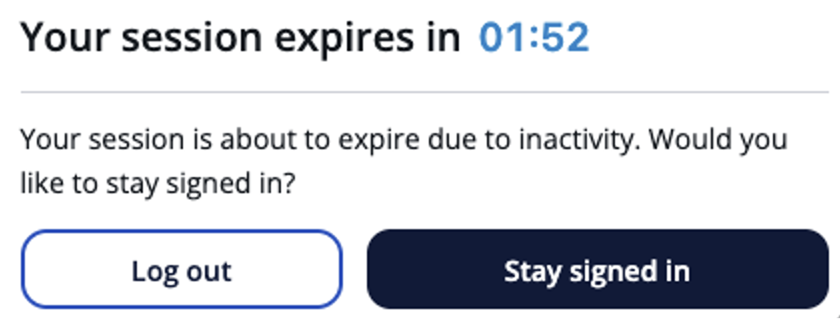 Two minutes before automatic logout, a notification “Your session expires in …” is displayed to the user:
